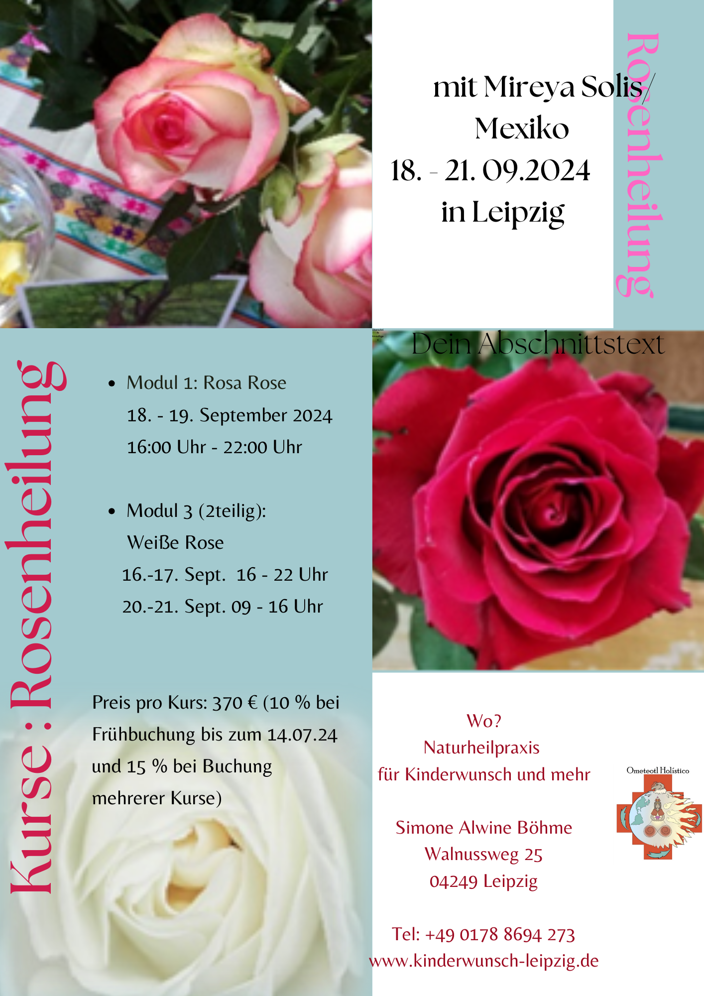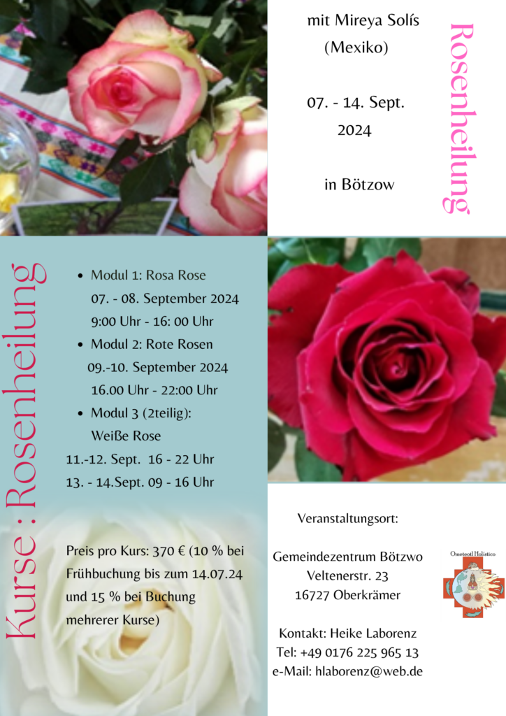 Im Frühjahr wird Mireya wieder in Deutschland sein, um die mexikanische Rosenheilung zu lehren, ein umfassendes aus 12 Modulen bestehendes Heilsystem, das der mexikanische Heiler Felipe Maza hervorgebracht hat. Wir haben über die letzten Jahre sehr gute und auch besondere Erfahrungen und Heilerfahrungen mit dieser Methode gemacht, die Mireya seit 2022 in Deutschland lehrt, und freuen uns sehr, dass wir auch im kommenden Jahr wieder Kurse anbieten können, damit diese Heilung weiter Verbreitung in hierzulande und in Europa findet.